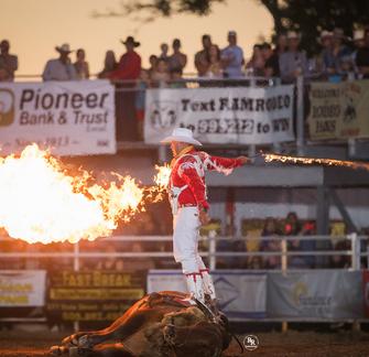 This year's rodeo specialty act Brian Patton-The Misfit Cowboy is a specialty performance act rooted in western flare, with a saddle broke trick trained American Red Brahman Bull as the centerpiece. A variety act that consist of whips, ropes, gun spinning and a whole lot of fire . With the largest prop in professional rodeo he'll raise a 1800 pound bull through the roof of a moving 40 foot trailer. A family friendly show and western exhibition at it finest.